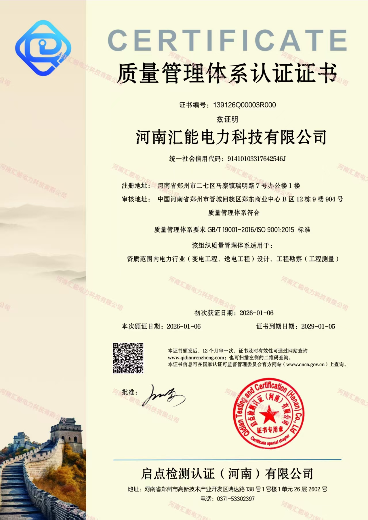 质量管理体系认证证书